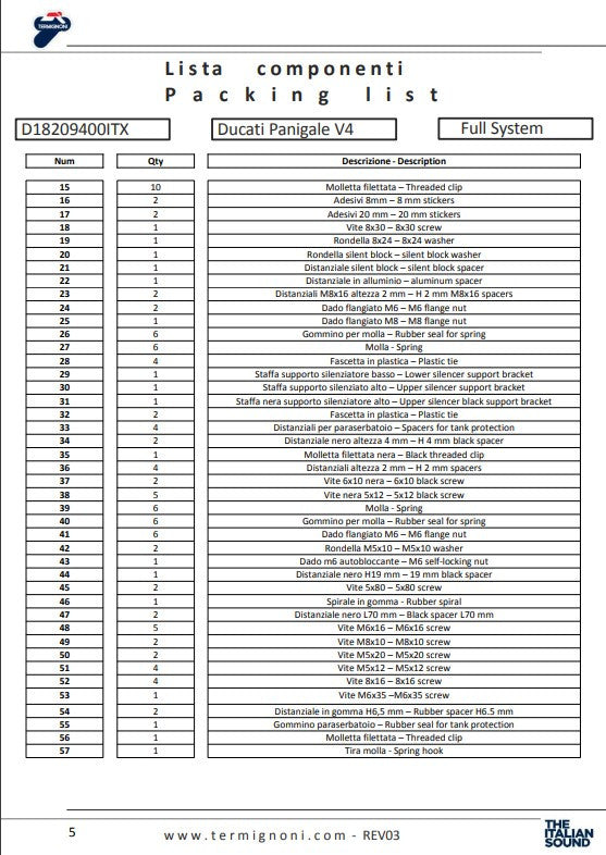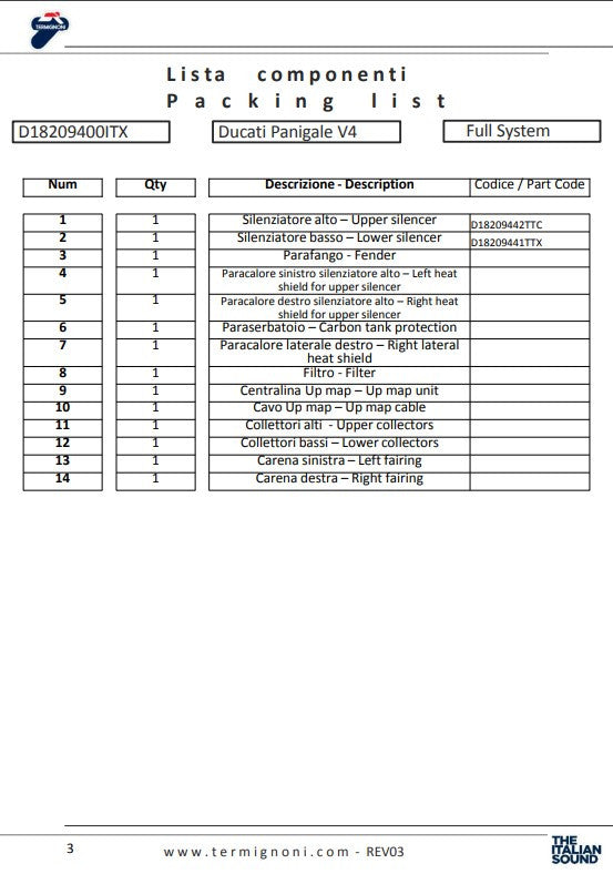 Termignoni 4USCITE kompletna ispušna cijev za Ducati Panigale V4/S (2018-2024) je napredna trkačka solucija koja je dizajnirana za korištenje na trkaćoj stazi. Ova ispušna cijev je posebno razvijena kako bi pružila maksimalnu snagu i optimiziranu reakciju na gas kroz cijeli raspon obrtnog momenta i snage. Sustav je podijeljen u dva dijela: gornji i desni bočni, što optimizira odvod ispušnih plinova za maksimalnu učinkovitost.