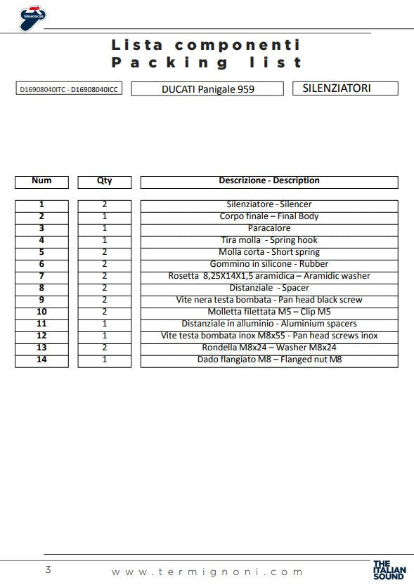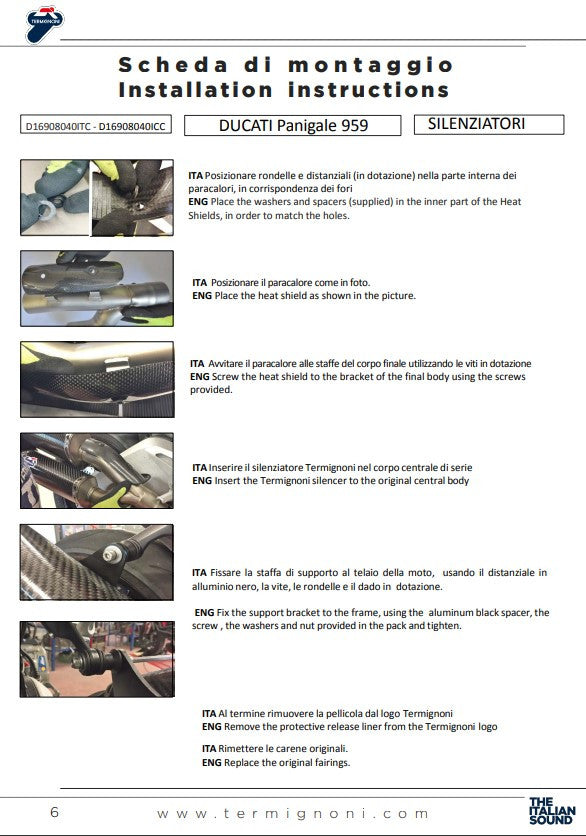 Karbonski završetak dodaje ispušnom sustavu sportski izgled i dodatno smanjuje ukupnu težinu. Karbonska zaštita od topline uključena je u paket i osigurava optimizirano disipiranje topline i dodatnu zaštitu. Ispušni sustav ima E-broj i odobren je za Euro 4 modele Ducati Panigale 959, što ga čini pogodnim za cestovnu upotrebu.